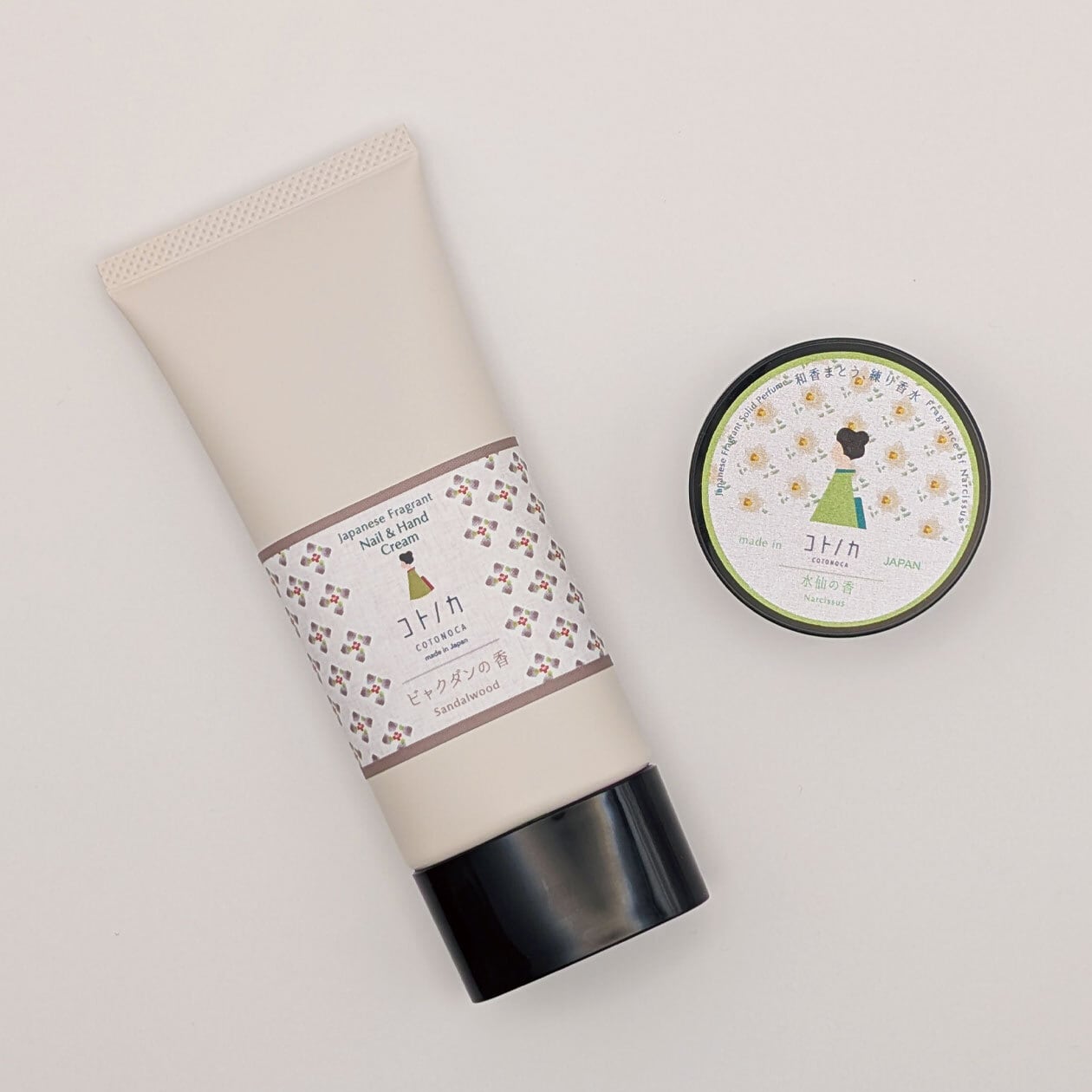 和香まとう、ネイル&ハンドクリーム 60g 4 種類のヒアルロン酸、コメヌカ油、スクワラン、カイコまゆエキス、ヨモギ葉エキス、チャ葉エキスなど、スキンケアにも配合される美容成分を厳選して配合したネイル&ハンドクリームです。べとつかずしっとりスベスベな使用感です。 ・パラベンフリー、鉱物油フリー、アルコール(エタノール)フリー、合成色素フリー 【金木犀の香】秋の澄んだ空気にたなびく金木犀の香りをイメージした優しく温もりのある香り。 【白檀の香】懐かしく、親しみと温もりが調和する香り。気品のある優しい和の香りに心が和みます。 【さくらの香】古来より日本人に親しまれる桜。春の訪れを告げる満開の桜をイメージした、フローラルブーケ調の甘く優しい香り。 【ハッサクの香】旬を迎えた八朔の皮を剥いた瞬間に溢れ出す芳醇な香り。ビターなピール感が印象的な、もぎたてでジューシーな香りに仕上げました。 【桃の香】ゆっくりと甘さを育てる追熟の時間に着想を得た香り。まだ青みのある桃の香りから、優しい甘さが際立つ香りへ。